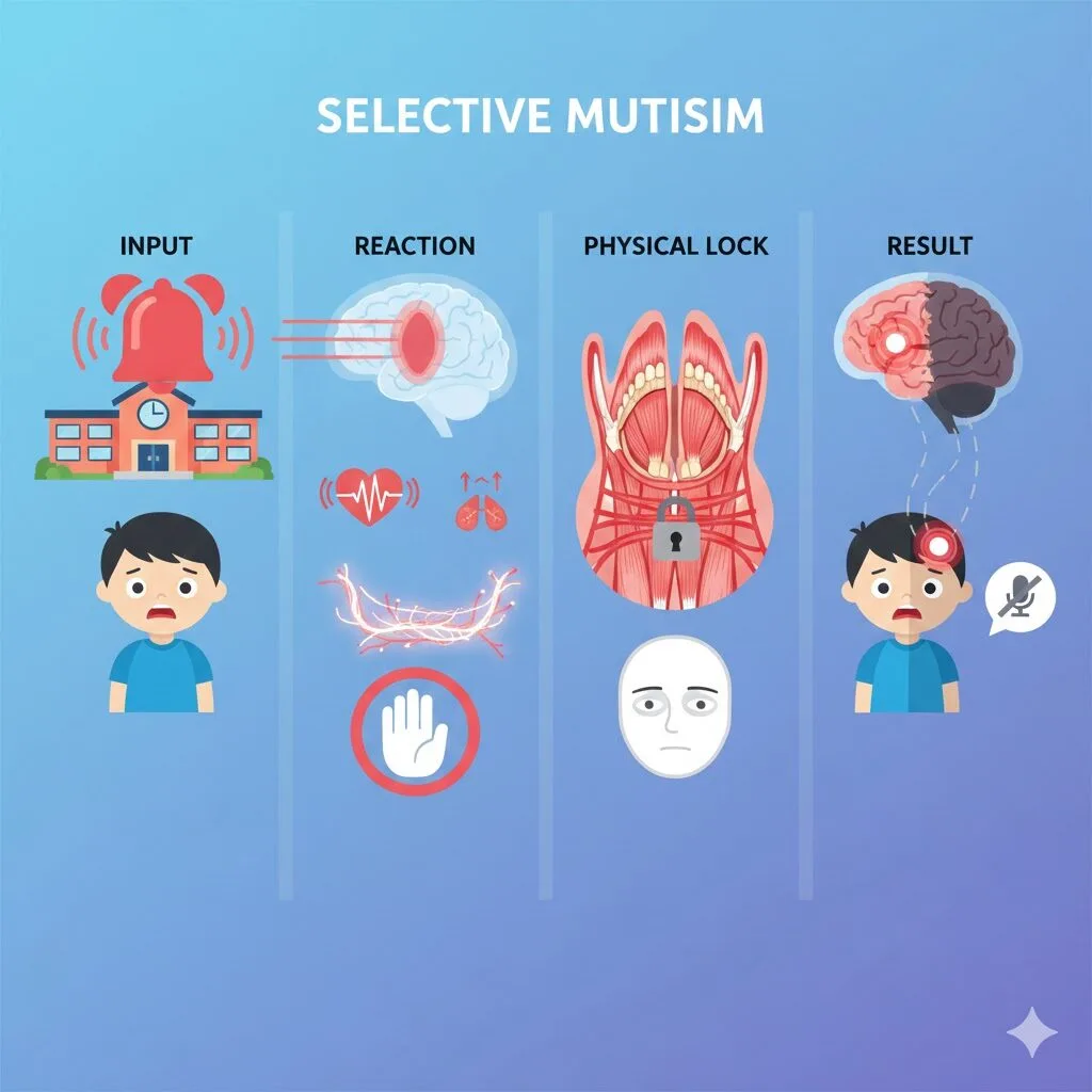 - 過敏な反応: 場面緘黙の子どもは、この扁桃体が非常に敏感です。安心できる家庭以外の場所(学校など)に入ると、脳がそこを「生命を脅かす危険な場所」と誤認し、強力なアラームを鳴らします。